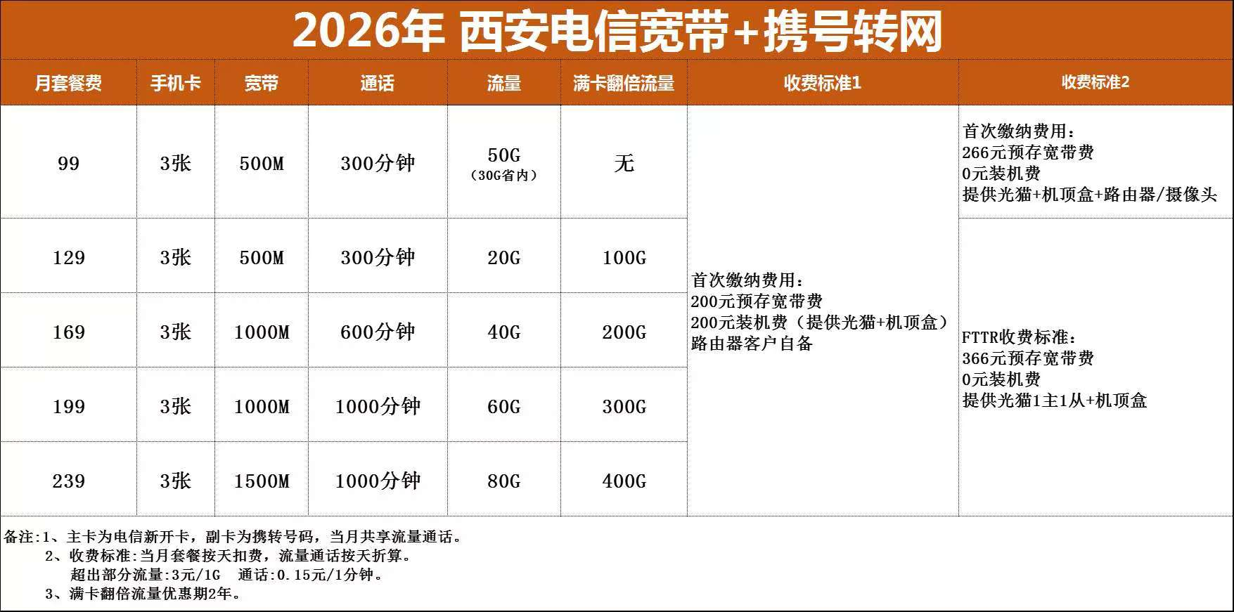 西安电信宽带99元套餐:提供500M光纤宽带、1路IPTV和3张手机卡共享套餐,包含300分钟全国通话和20GB国内流量。 西安电信169元套餐:提供1000M光纤宽带、1路IPTV和1张手机卡共享套餐,包含600分钟全国通话和40GB国内流量。 西安电信199元套餐:提供1000M光纤宽带、1路IPTV和3张手机卡共享套餐,包含1000分钟全国通话和60G国内流量。 西安电信239元套餐:提供1500M光纤宽带、1路IPTV和3张手机卡共享套餐,包含1000分钟全国通话和80GB国内流量。 西安电信宽带299元套餐:提供2000M光纤宽带、1路IPTV和3张手机卡共享套餐,包含1500分钟全国通话和100GB国内流量。 此外,西安电信还提供了单宽带包年选项,如300M宽带500元包年,500M宽带900元包年,1000M宽带1600元包年。这些套餐提供了不同的网速、数据流量和通话时间,满足不同用户的需求。首次办理的用户还可以享受预存和安装费用优惠,例如预存200元并支付200元开户费,还可以获得光猫和机顶盒的提供。